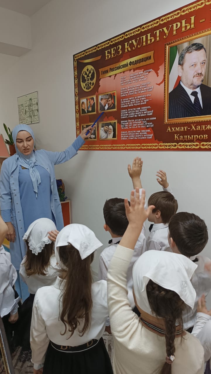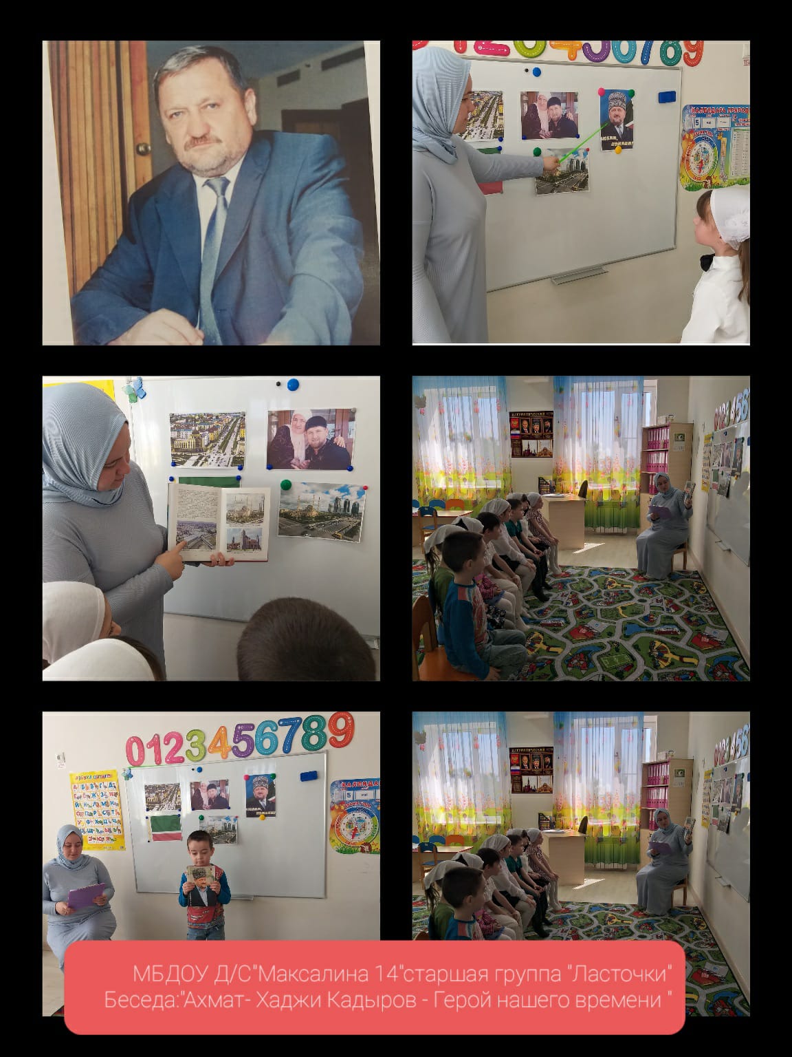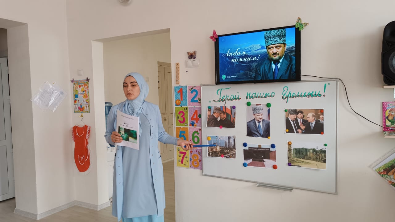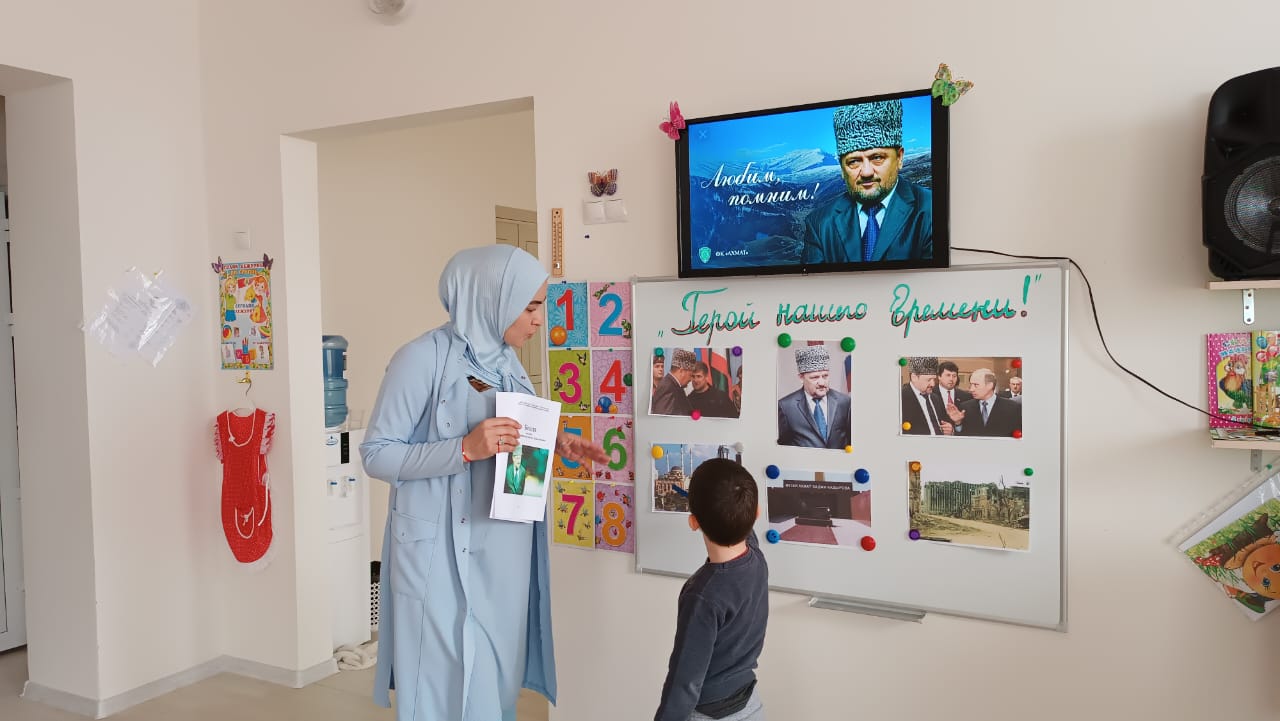 Во всех возрастных группах провели тематические беседы на тему: «10 мая -День памяти и скорби чеченского народа». По всей республике в эти дни прошли религиозные обряды- читали Мовлид и совершали зикр. В этот день вспоминают тех, кто отдал свою жизнь за наши надежды и мечты. Мирное небо хранит подвиги и имена героев, которые навечно вписаны в историю Чеченской Республики. В нашем ДОУ провели тематические беседы посвященные Дню памяти о Первом Президенте Герое России А.-Х. Кадырове- Герой нашего времени, где говорилось о том, как он пожертвовал своей жизнью, ради процветания и возрождения Чеченской Республики. Жизнь первого президента, отданная во имя свободы, принесла мир и спокойствия на чеченскую землю. Он всегда был, есть и будет Народным Героем России. Его поступки навечно останутся в сердцах народа. Фасад здания был оформлен баннером, также в группах были вывешены стенды и газеты, посвященные Первому Президенту А.-Х. Кадырову.
