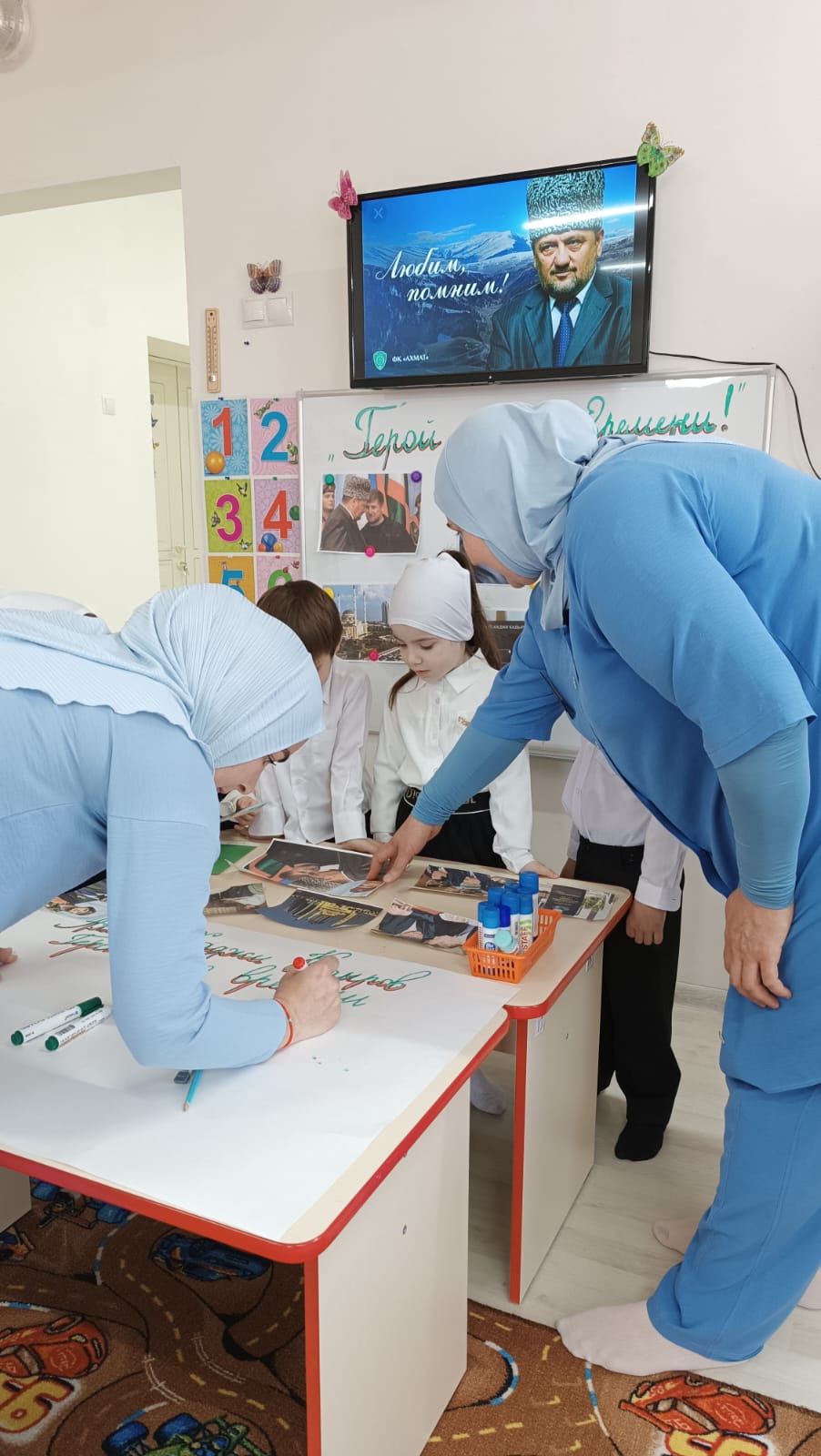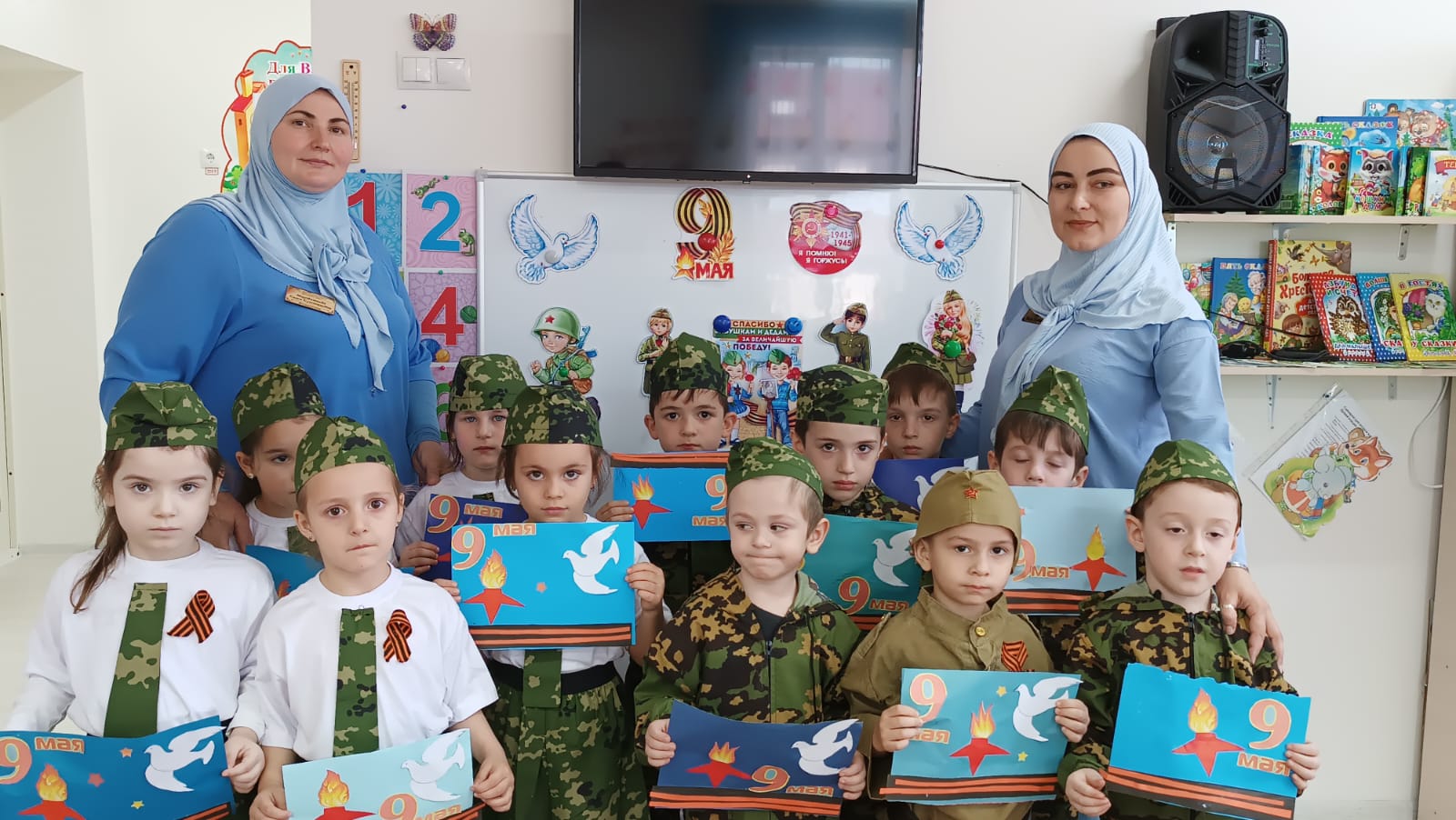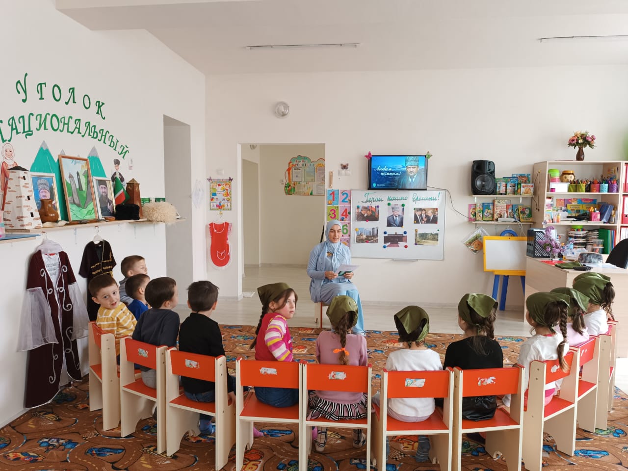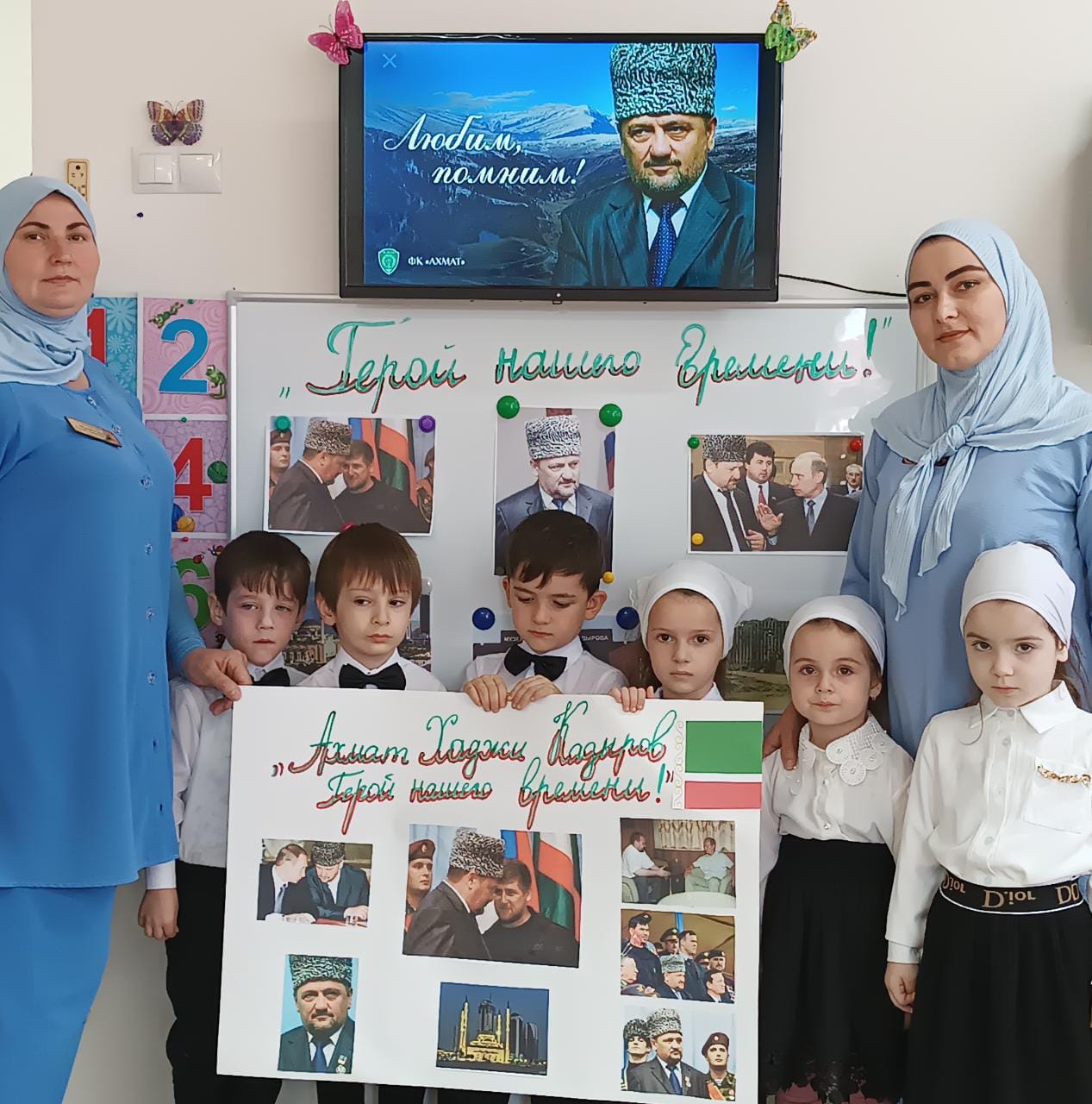 Во всех возрастных группах провели тематические беседы на тему: «10 мая -День памяти и скорби чеченского народа». По всей республике в эти дни прошли религиозные обряды- читали Мовлид и совершали зикр. В этот день вспоминают тех, кто отдал свою жизнь за наши надежды и мечты. Мирное небо хранит подвиги и имена героев, которые навечно вписаны в историю Чеченской Республики. В нашем ДОУ провели тематические беседы посвященные Дню памяти о Первом Президенте Герое России А.-Х. Кадырове- Герой нашего времени, где говорилось о том, как он пожертвовал своей жизнью, ради процветания и возрождения Чеченской Республики. Жизнь первого президента, отданная во имя свободы, принесла мир и спокойствия на чеченскую землю. Он всегда был, есть и будет Народным Героем России. Его поступки навечно останутся в сердцах народа. Фасад здания был оформлен баннером, также в группах были вывешены стенды и газеты, посвященные Первому Президенту А.-Х. Кадырову.